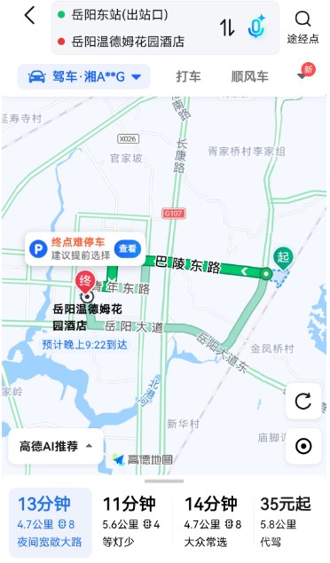 岳阳东站→岳阳温德姆花园酒店:驾车约5km,用时约13min,打车约11元;也可出站乘公交30路前往,用时约35min。