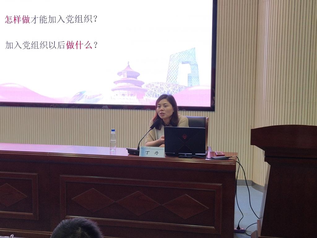丁丹围绕端正入党动机的含义及其重要意义、当代大学生不良入党动机的表现及其纠正、党性修养的含义及当代大学生加强党性修养的途径、牢记“初心使命”和“责任担当”四个方面进行授课。她通过陈独秀、毛泽东典型例子指出我们要以信仰、拥护共产主义,为了献身共产主义,更好地为人民服务而入党。同时对比各种不良入党动机来突出“信仰型入党动机”的重要性。她强调我们要加强新时代大学生党员的“四练”:加强理论学习加强思想淬炼、坚定理想信念加强政治历练、强化责任担当加强实践锻炼、锻炼过硬本领加强专业训练,以及从强思想、提能力、践行动等方面加强党性修养。她希望我们能够像近期结构设计大赛中的青年志愿者一样,做到为人民服务不怕苦、不喊累;要求我们时刻践行“坚持原则、认真负责”八个字,牢记自己的责任与使命,不负时代重托,不负青春韶华。