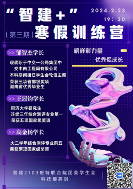 为巩固提升学生科创综合素质能力,助力学校拔尖创新人才培养,2月21日至23日,土木学院智能建造2103班联合院团委学生会科技部举办“智建+”寒假科创训练营活动,重点面向低年级本科生和科创训练团队。训练营举行了3场专题培训,活动覆盖300余人。