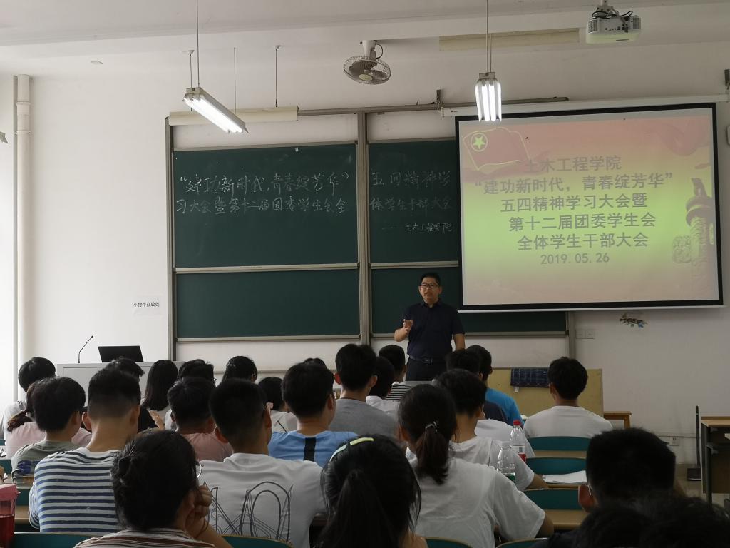 5月26日下午,土木工程学院“建功新时代,青春绽芳华”五四精神学习大会暨第十二届团委学生会全体学生干部大会于云塘校区召开。学院第十二届团委学生会全体学生干部参加会议。院团委书记李小军主持会议。