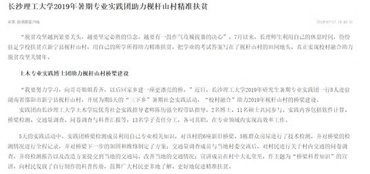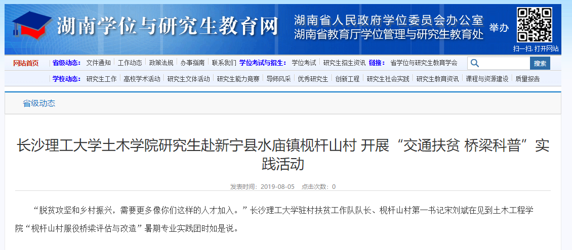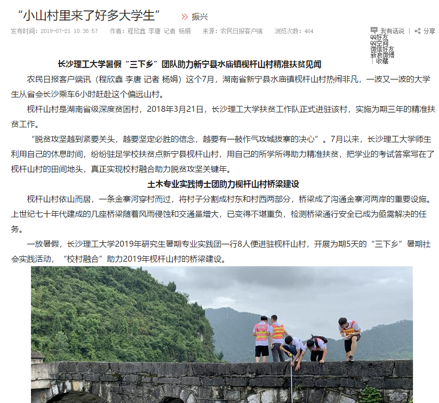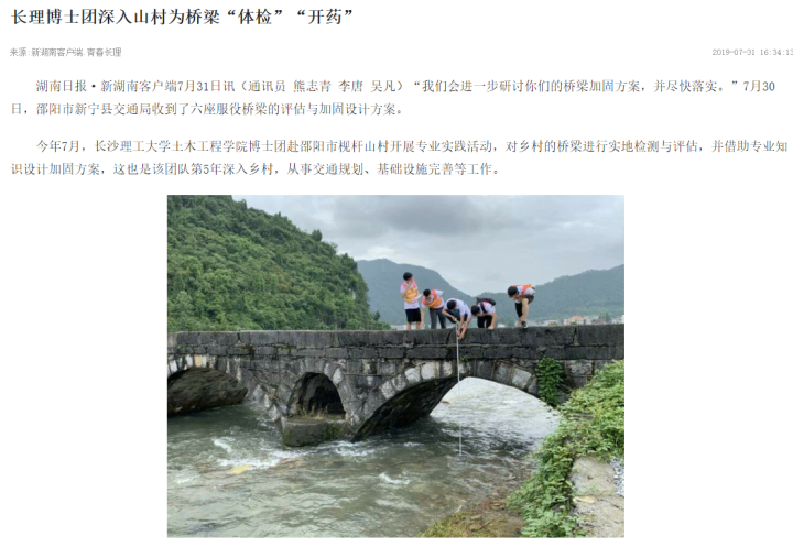 新宁县电视台、新湖南、湖南省学位办、国家纸质媒体《农民日报》等媒体对本次暑期专业实践活动进行了报道。其中,新宁县电视台进行了全程的跟踪采访,并于当地的晚间新闻进行了详细报道。枧杆山村村支部书记杨忠祥在接受电视台采访时说道:“这个一年零三个月的时间,太阳成集团tyc122cc入口扶贫工作队为我们村里的基础设施建设做了很大的贡献,比如建设了新的桥梁、水渠。并且向各方面争取了大量资金,帮我们村里的基础设施搞到很到位,特别是今年七月份,太阳成集团tyc122cc入口土木工程学院暑期专业实践博士团在我们村里,对一些旧的桥梁以及新桥做了检测,也提出了非常好的方案,我非常感谢他们对我们村里的技术帮助。”