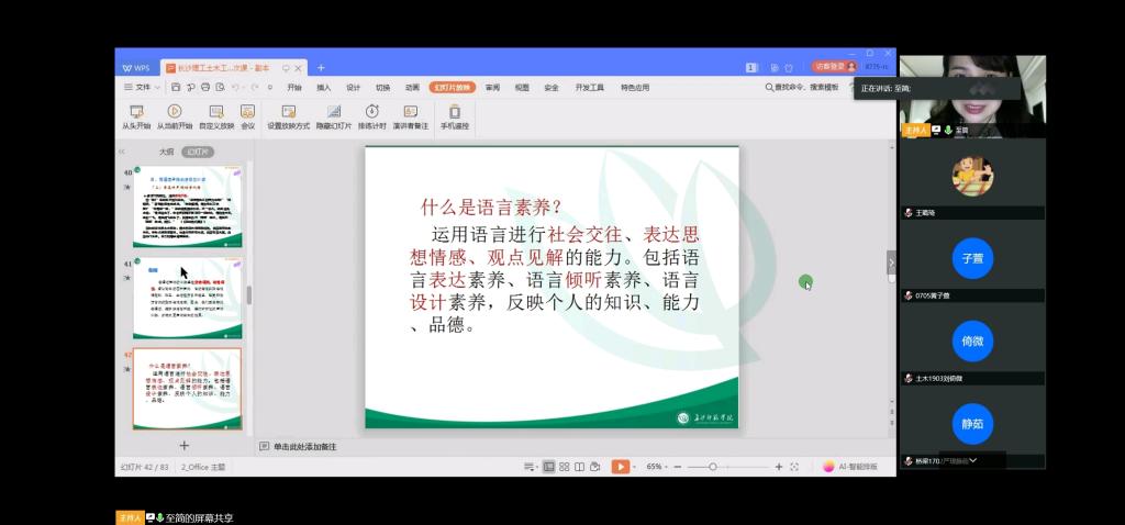 课程伊始,马伶就上堂课向学员们传授的内容,以读绕口令的形式对学员的发音技巧进行复习巩固。她凭借自己丰富的普通话教学经验,对每个学员的发音予以详细的点评,并对症下药,为每个学员提出相应的练习方法,希望其在以后的发音中可以做到“多重视,多练习”。紧接着,马伶进一步向学员们阐述了开展本门课程的意义。她认为,课程的开展就是为了提高学员们的语言素养,即提高学员们运用语言进行社会交往、表达思想情感、观点见解的能力,而语言素养提升的重点内容分为沟通畅通、表达灵动两大块。她表示,第一堂课讲授的课程为沟通畅通打下了基础,而本堂课重点在即兴发言的技巧锻炼上。