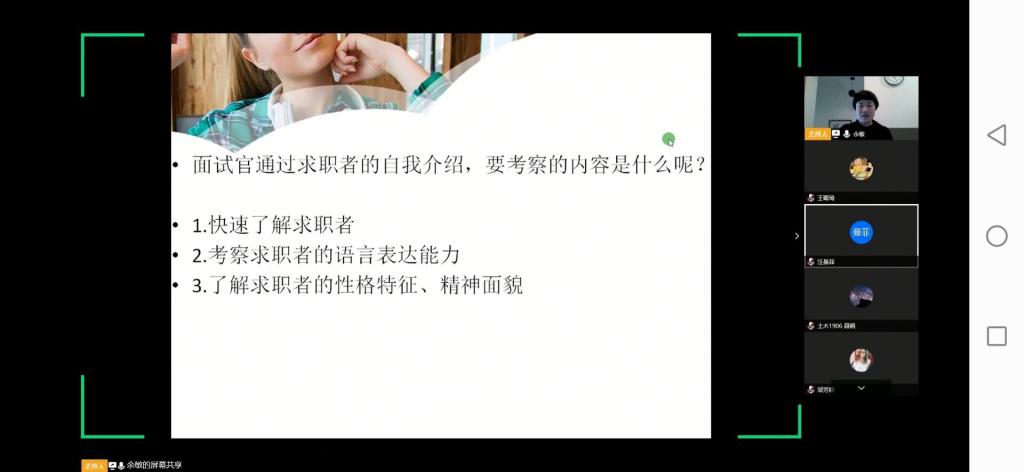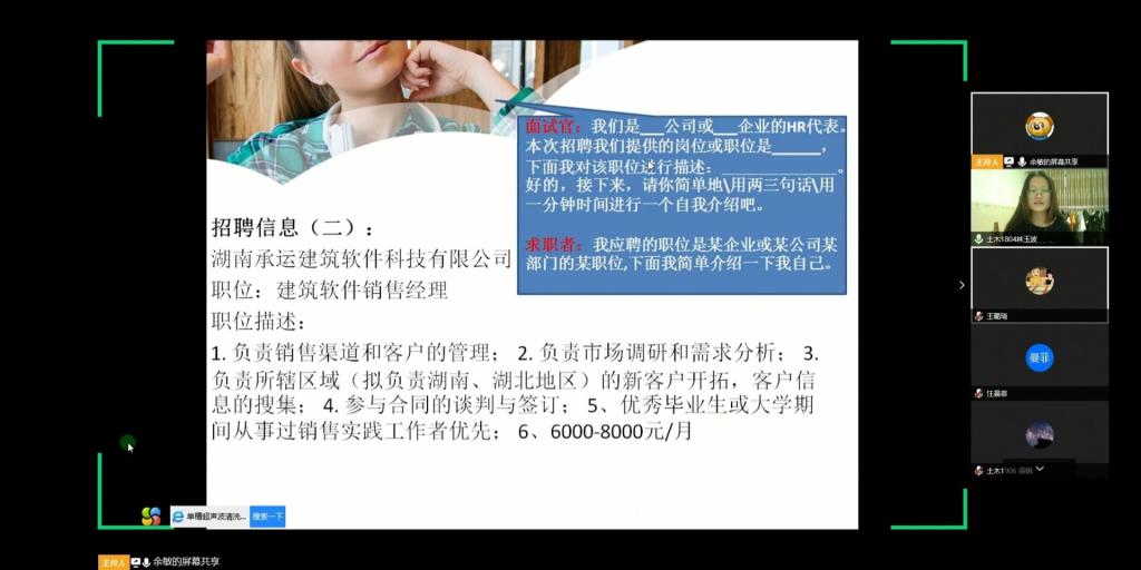 最后,余敏安排了一场HR面试评审模拟。由6名同学担任面试官,其他同学是求职者,求职者既要让面试官快速了解自己,也要展现自己的性格特征和精神面貌。第一位求职者是土木1804班的林玉波,她将自己带入到一位软件销售员求职者中去,完成了自己言简意赅的演说。接着6位评审也相继发言,阐述自己对这位求职者的看法。后面一轮中,李耀同学作为求职者的发言以及评审同学的点评同样精彩。