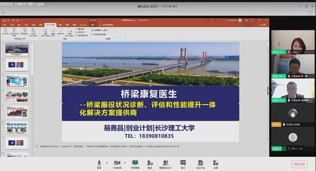 在创业计划竞赛类中,首先出场的团队展示的项目为“Dr. Bridge桥梁医生”。演示者分析了当前我国的桥梁建设背景,以及现阶段的发展与需求,推出了自身的优势技术CFRP材料,并围绕着业务规划,战略发展,团队人员进行了介绍。“Abio-大国智造BIM资源优选平台”主打多端智慧学习平台,涵括pc端、小程序、app、网页端口,为用户提供信息共享查询。“桥梁康复医生--桥梁服役状况诊断、评估和性能提升一体化解决方案提供商”就当前桥梁修复技术难点,研发出专业软件,只需输入关键参数,便可完成智能诊断和评估;且该项目将修复过程系统化,以达成“诊、评、治”三位一体。19级团队也对项目“5G对未来发展影响以及如何协调好与其他产业关系”进行了精彩的展示与介绍。
