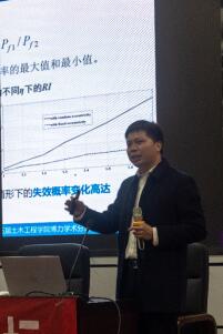 蒋友宝教授以汶川地震桥梁房屋柱体的损伤引入讲座,指出混凝土偏压构件截面偏心距值变异性较大,超出规范较多,所以有一定的研究必要。蒋教授通过偏心柱极限状态方程对比进行双偏压柱可靠度的模型分析,通过一系列对比,一般通过钢筋超配来调整失效概率。随后蒋教授对中美欧规范混凝土柱承载可靠度对比,中美两国规范在承载力计算上形式一致,但中国用设计值,美国则是名义值,系数也存在差异,但中美双方的稳定性系数波动范围都很大,我校对美国规范进行了优化并将成果发表在了美国土木工程学报上。欧洲规范也大致相同。最后蒋教授介绍了他们团队在柱可靠性上的一些专利情况,为我们开拓了思路,例如在失效部位设置芯柱和可更换部件的钢筋混凝土柱。