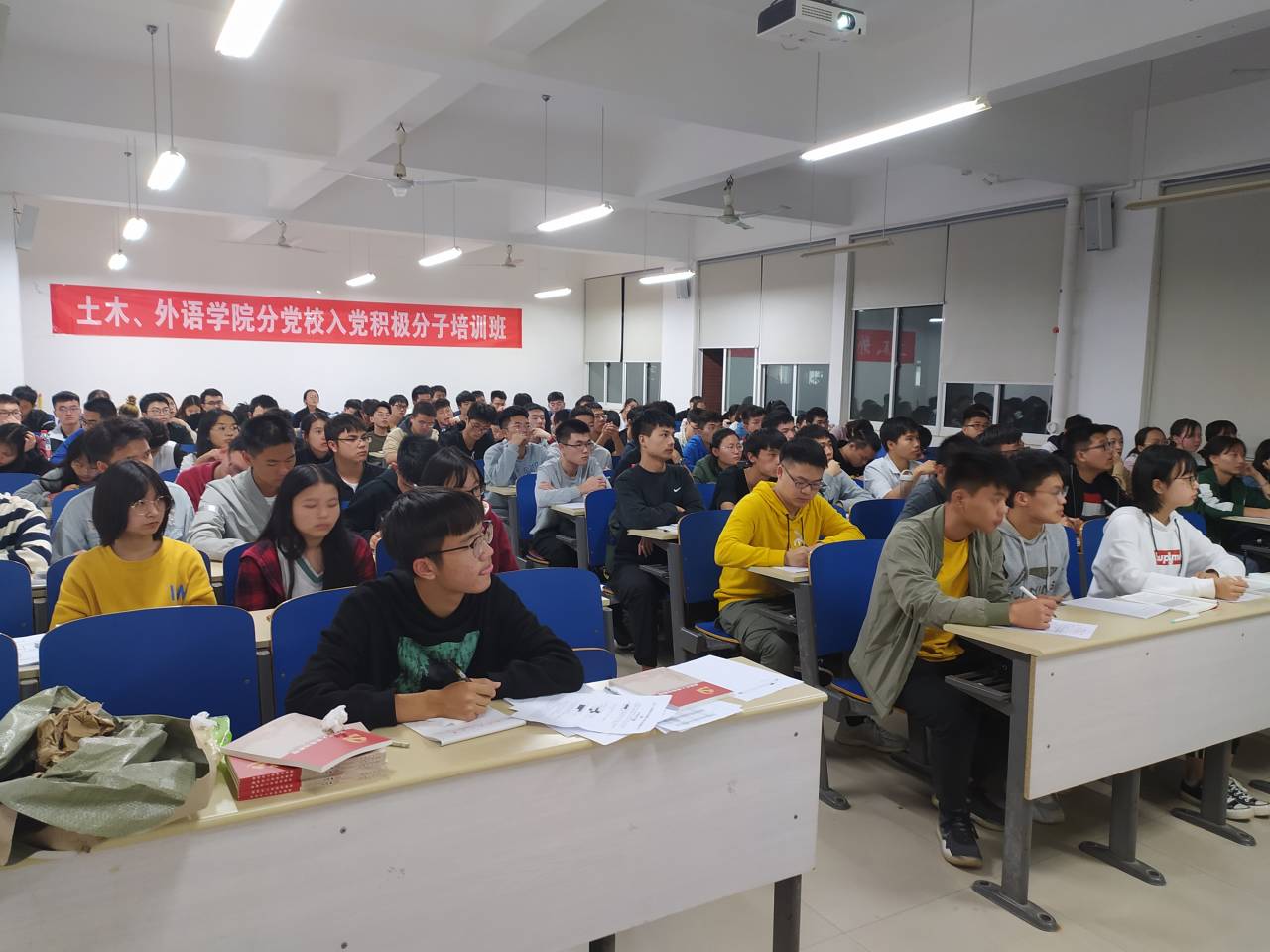 11月13日晚,土木、外语学院分党校组织第34期入党积极分子在工科一楼A214开展《习近平新时代中国特色社会主义思想》专题党课,由马克思主义学院副教授郭华进行授课,培训班全体学员参加。