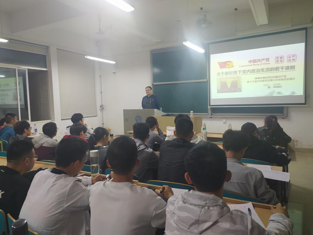 本次党课的主题为《关于新形势下党内政治生活的若干准则》。任志祥以准则的制定背景开篇,就“为什么要制定最新准则”这一问题与学员们进行了深刻的探讨,并详细阐释了制定新准则的必要性。他讲到,党员要时常进行自我净化,政治立场必须坚定。随后,任志祥对《准则》五个方面的鲜明特点进行了具体说明,并详细解读了《准则》的主要内容。最后,任志祥向学员们强调严肃党内政治生活是全面从严治党的重要基础,并希望学员能严格遵守党内政治生活的若干准则,严格要求自己,起到模范带头作用。