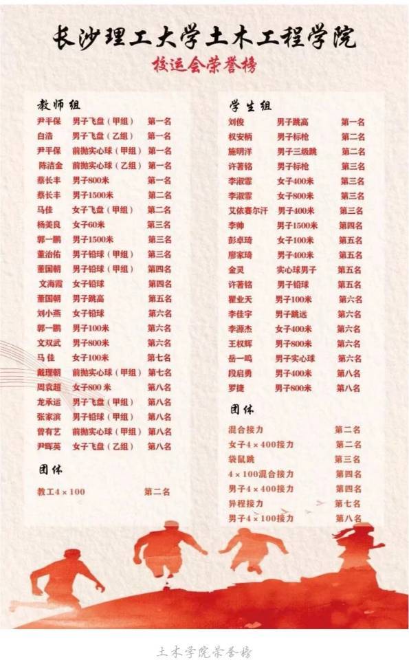 在本次运动会中,土木学院取得了教师团体总分第二名、学生团体总分第四名的好成绩。其中,土木学院在田赛中取得了骄人成绩。尹平保在教师男子飞盘、前抛实心球中夺得了双料冠军,刘俊勇夺学生男子跳高第一名,权安柄、许著铭分列学生男子标枪亚季军。土木学院在径赛中也取得了不错的成绩。蔡长丰分别在教师男子800米、男子1500米中获得冠亚军,李淑霏在学生女子400米、800米中都夺得第三名。在团体赛中,土木学院在教师4×100接力赛、学生女子4×400接力赛、师生混合接力都取得了第二名,在袋鼠跳中取得了第三名的好成绩,与去年相比有着巨大进步。其他参赛选手也都发挥了自己的体育水平,获得了出色的名次。