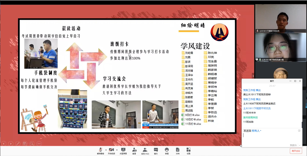5月15日晚,土木工程学院“党员先锋说”(第三期)暨2020年下班工作答辩会在线上如期举行,院党委副书记黄阿明,院团委书记綦丽,学工办龙承运、董治佑与2019级所有下班党员、下班团干参加答辩会,会议由学生党总支副书记李小军主持。