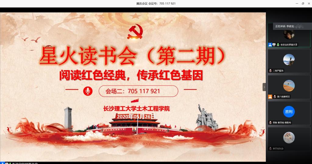 5月26日下午,由土木工程学院党委主办的“疫情防控践初心、严峻斗争担使命”系列主题党日活动——星火·读书会(第二期)于腾讯会议平台举行。本次读书会的主题为“阅读红色经典,传承红色基因”,学生党总支副书记李小军、第21期预备党员培训班、第35期积极分子培训班部分学员参加读书会。