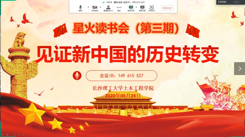 5月26日晚,由土木工程学院党委主办的“疫情防控践初心、严峻斗争担使命”系列主题党日活动——星火·读书会(第三期)于腾讯会议平台举行。本次读书会的主题为“见证新中国的历史转变”,学生党总支副书记李小军、学院第21期预备党员培训班部分学员以及第35期积极分子培训班部分学员参与读书会。
