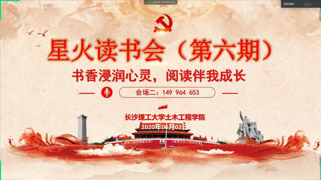 6月2日下午,由土木工程学院党委主办的“疫情防控践初心、严峻斗争担使命”系列主题党日活动——星火·读书会(第六期)于腾讯会议平台举行。本次读书会的主题为“书香浸润心灵,阅读伴我成长”,学生党总支副书记李小军、学院第11期发展对象培训班部分学员参与读书会。
