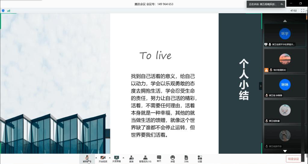 “这次读书分享会能够吸收其他人对事物的思考,获得点点滴滴的收获让我感到高兴。从蒋环宇同学分享的《活着》中我明白我们应该从生活中和书中的故事体会到人生的道理,学会如何将自己这短短几十年的生命活得精彩,人人都有自己的价值,我们要让温暖传递开来。”第11期发展对象、土木1807班申翔这样谈到。