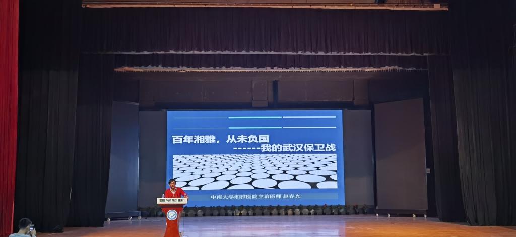 赵医生以“百年湘雅,从未负国”为主题,给大家讲述从武汉疫情暴发志愿逆行,到在武汉协和医院西院区重症区争分夺秒抢救病人,最终凯旋的战疫情况和心路历程。他说这就是和平年代的战场,而他有幸成为战士。逆行武汉,共赴国难,不仅是个人的英勇无私,更是整个家庭的默默支持。面对凶猛的疫情,赵医生说怕是人之常情,但是他不畏牺牲。他给大家分享了他在武汉抗疫时亲身经历的几个片段。