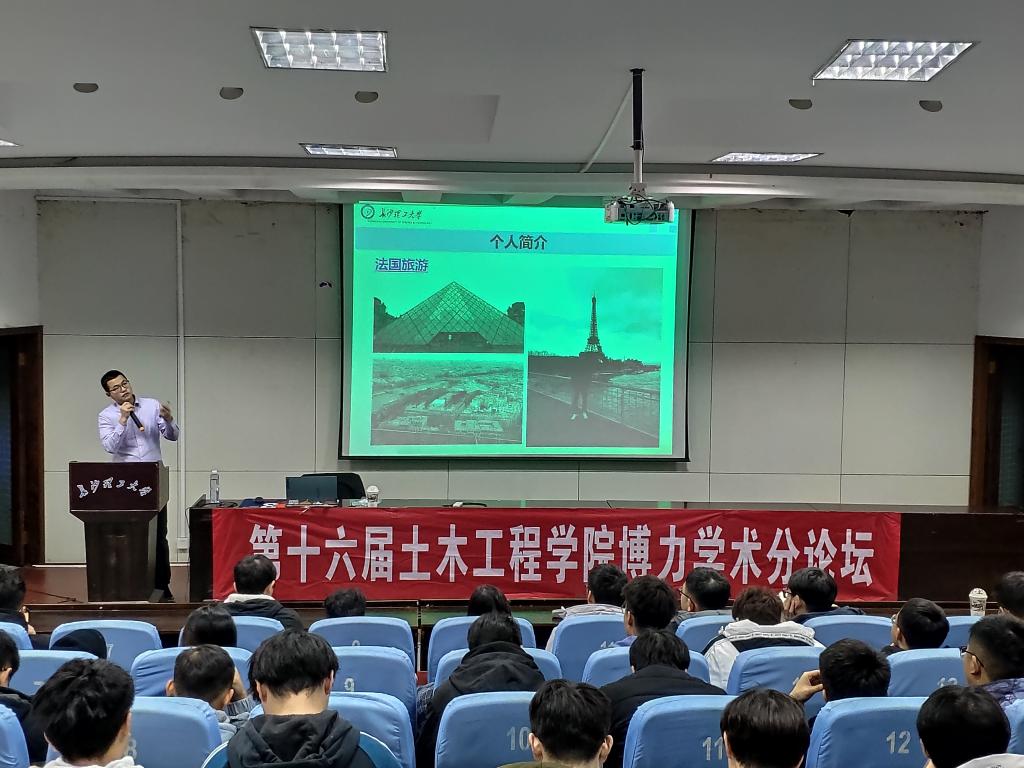 12月3日晚,土木学院第十六届博力学术分论坛第十二场讲座于金盆岭校区12教200教室顺利举行。此次论坛由我院戴理朝讲师主讲“锈裂先张混凝土结构预应力损失及承载力研究”,院研会主席王冲主持,研究生共计到场200余人。