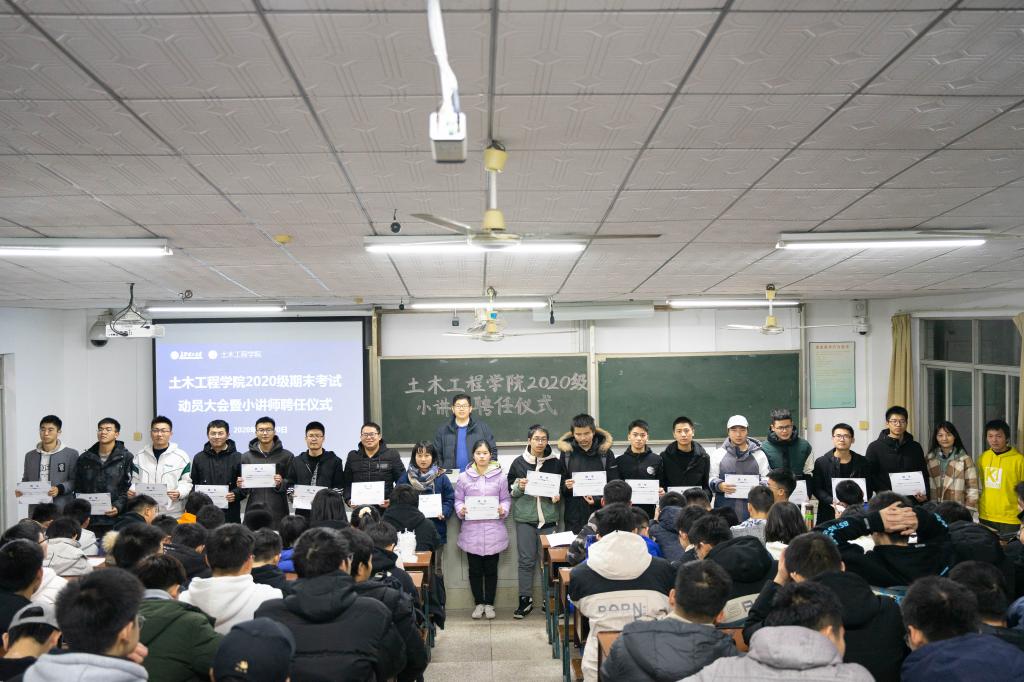 为进一步为严肃考风考纪、培养优良学风、营造诚信考试氛围,加强2020级学风建设,12月30日晚,土木工程学院在金盆岭校区12教举行了2020级期末考试动员大会暨“小讲师”聘任仪式。2020级辅导员李小军、文岚,年级分会全体成员,各班班长、学委及小讲师参加活动。