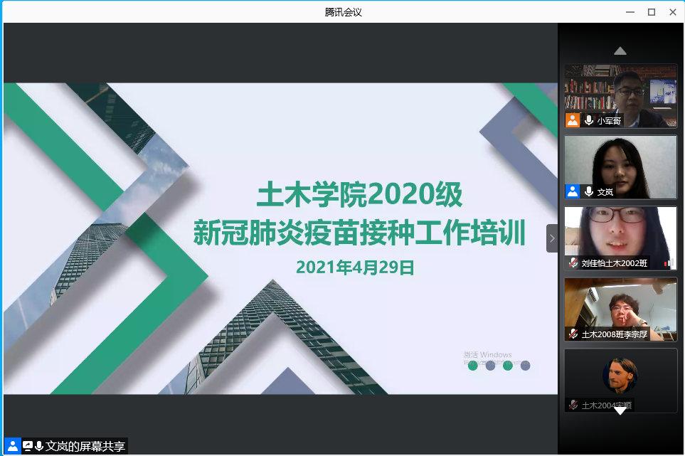 为做好在校学生新冠肺炎疫苗接种前期准备工作,确保接种工作的顺利开展,4月29日,土木工程学院召开了2020级新冠肺炎疫苗接种工作培训会,针对2020级全体新生进行了新冠肺炎疫苗接种工作培训。2020级辅导员李小军老师,文岚老师和同学们认真学习了新冠肺炎疫苗接种的相关要求和内容。