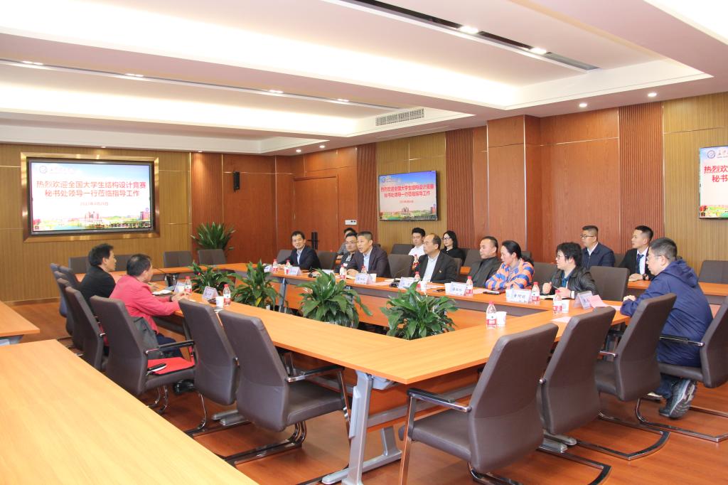 王磊首先代表学院对毛一平和丁元新副秘书长的莅临表示热烈欢迎并介绍了学校、学院的基本情况。他表示,学院全力配合赛事组委会,高质量推进赛事的前期筹备工作。全力保障赛事的顺利举办。付果从“赛题简介、未知参数、加载步骤、设备模拟、场地布置”五个方面详细汇报了前期的命题工作,并得到了秘书处专家的高度赞扬。黄阿明代表学院汇报了第十六届全国结构设计竞赛前期筹备情况,重点从“赛事经费、赛事协商、场馆准备、文稿撰写、物料设计、赛事相关准备”六个方面介绍了学院目前的竞赛筹备进展,表示学院将继续深入谋划,保障大赛筹备工作高效有序推进。
