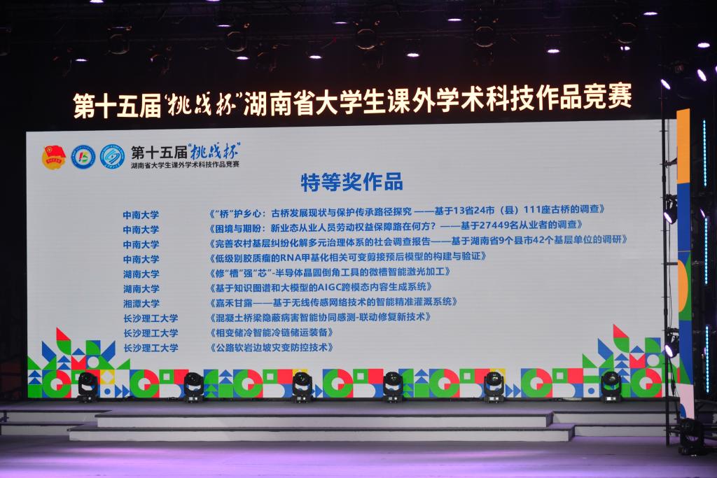 5月22日,由共青团湖南省委、省教育厅、省人力资源和社会保障厅、省科学技术协会、省学生联合会共同主办,我校承办的第十五届“挑战杯”湖南省大学生课外学术科技作品竞赛终审决赛顺利完成各项议程,在云塘校区大会堂举行终审发布会,共青团湖南省委书记李志超,中国工程院院士印遇龙,共青团湖南省委副书记叶妙,太阳成集团tyc122cc入口党委副书记刘建民,湖南省社会科学院党组成员、副院长王佳林,太阳成集团tyc122cc入口副校长钱国平,湖南省科学技术协会二级巡视员张学军,共青团湖南省委学校部部长陈艳英,湖南省教育工委宣传部二级调研员傅联红出席发布会,大赛评委、获奖选手、各高校代表和指导老师参加发布会。
