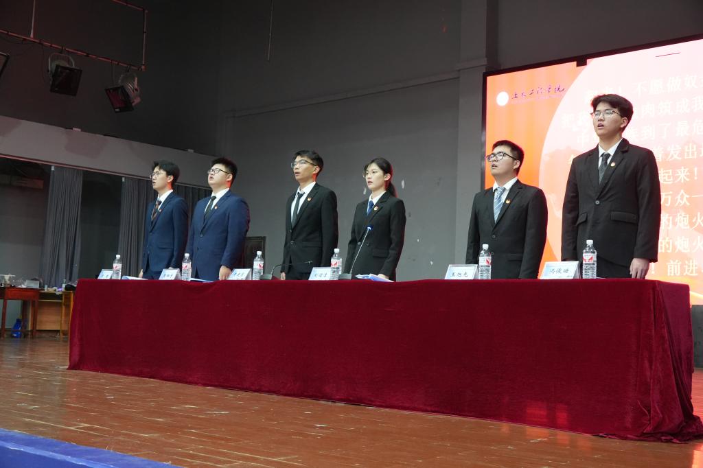 第十六届学生会主席团轮值主席费建望作题为《勇立时代潮头,争做时代先锋,在决胜建成“百强”大学之际 青年学子在行动》的工作报告,总结过去一年院团委学生会取得的成绩,明确下一阶段工作目标。
