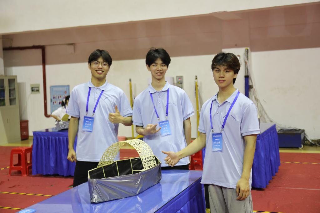 本届赛题为冲击荷载作用下乌篷船结构设计与制作,要求参赛团队针对船头和船舱货物静载、钢球冲击荷载工况对船体结构进行受力分析、结构设计、模型制作及加载试验。本届大赛吸引了全省33所高校的93支代表队参与角逐。校本部1队(成员:龚宇、陈志超、应世浩)制作的“共潮生”作品,以71.3g的结构总重、145mm的船体高度、一级随机抽取一侧船头加载1kg荷载、二级船舱中部加载12kg货物静载、三级500mm高1.12kg钢球自由落体的冲击荷载、四级500mm高1.7kg钢球自由落体的冲击荷载(均为满载)的优异成绩,成功摘得本届大赛的冠军。