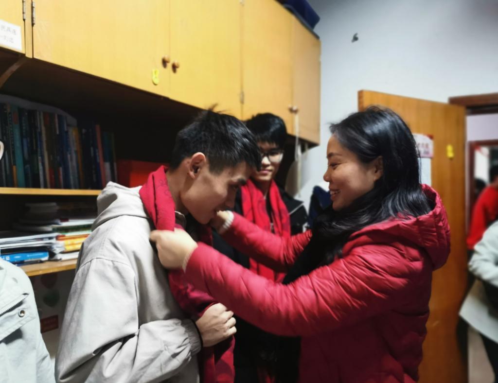 每到一间寝室,各位领导、老师都与学生们亲切交谈,了解大家目前的备考状态,鼓励大家要坚定自信,保持好的心态,一定可以取得优异的成绩。王桂尧副院长强调,“自信是成功的法宝,考场也是战场,狭路相逢勇者胜”。丁丹副书记也为大家送上考前祝福,祝福大家考试顺利,考出自己的真实水平,考上自己心仪的学校。其他领导、老师也提醒大家自觉遵守考试纪律和考场规则,不要相信不法分子的蛊惑。慰问结束后,各位领导、老师亲手为每位考研学生系上印有“福”字的红围巾,这不仅是殷殷祝福,更是老师们对考研学子的期待和鼓励,是坚持到底的必胜信念,希望所有学生能在即将到来的考研考试中“鸿运当头”。到场的同学们脸上都洋溢着幸福的微笑并表示,一定不辜负学院领导和老师寄予的厚望,在几天时间里,坚定信心、一鼓作气,争取以优异的成绩回报学院的关心和支持。