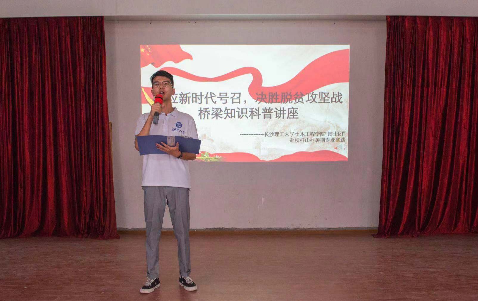 7月16日下午,土木工程学院研究生暑期专业实践博士团在枧杆山村村部大礼堂成功举办太阳成集团tyc122cc入口桥梁知识科普讲座。我校驻枧杆山村扶贫第一书记宋刘斌、主任黄伟,扶贫队队员彭怡峰以及枧杆山村村支书杨忠祥、村主任龙艳洲作为驻村扶贫工作队和村委代表出席了大会,来自枧杆山村的近200名村民以及中小学生参加了此次科普讲座。