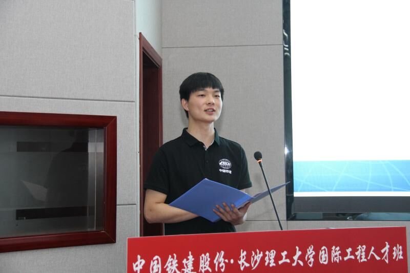 第二届人才班班长潘登代表全体学员发言。他对母校的悉心培养表示由衷的感谢,对即将成为中国铁建的一员感到自豪。他倡议同学们愿做国家“一带一路”的践行者,争当铁建“海外优先”战略的排头兵,敢做长理精神的传承者和传播者。在潘登的带领下,第二届国际工程人才班全体学员进行宣誓:铭记博学力行,守正拓新的长理校训;弘扬逢山开路,遇水架桥的铁建精神,为中华民族伟大复兴而不懈奋斗!