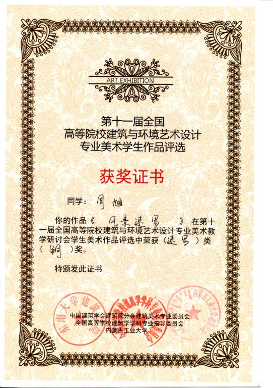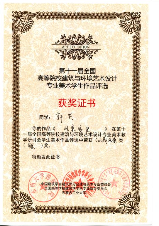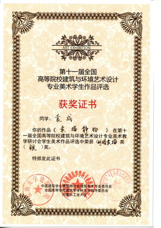 2011年9月22—26日,在内蒙古工业大学召开的第十一届全国高等院校建筑与环境艺术设计专业美术教学研讨会上传来喜讯,我校郭昊、袁成、周旭三位同学的作品分获风景写生类银奖、素描静物类银奖和风景速写类铜奖。指导老师李洁、殷俊、周志高、池春雷。这是由全国高等学校建筑学科专业指导委员会、中国建筑学会建筑师分会建筑美术专业委员会以及内蒙古工业大学联合组织和承办的第一次全国高等院校学生建筑美术作品评奖,在100多个院校入选的400多幅作品中由专家评定产生。另,我校学生郭昊、袁成、周旭、罗璇、唐荞菀、樊改霞、段红琪、王丛等八位同学的作品入选编入由中国建筑工业出版社出版的《学生作品集》,对这些同学表示祝贺!