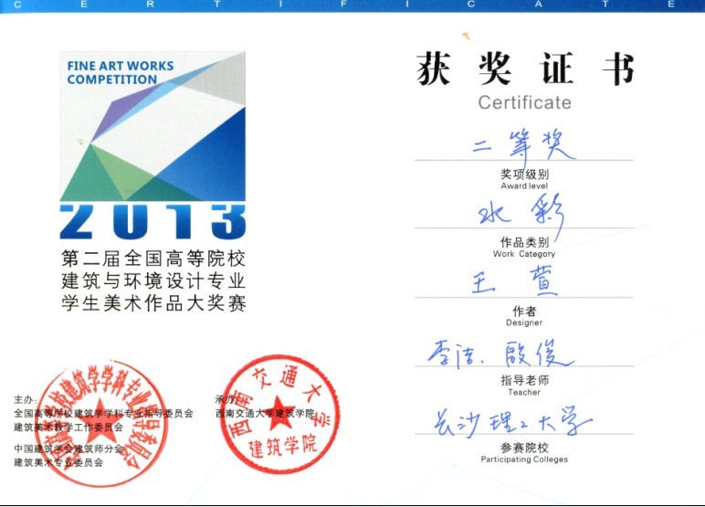 2013年5月17—19日,在西南交通大学召开的第十二届全国高等院校建筑与环境艺术设计专业美术教学研讨会上又传来喜讯,我校土建学院城市规划系学生王萱同学的作品喜获水彩类银奖。这是由全国高等学校建筑学科专业指导委员会、中国建筑学会建筑师分会建筑美术专业委员会以及西南交通大学联合组织和承办的第二届全国高等院校建筑美术作品比赛,规模比第一次更大,覆盖面更广,水彩类银奖作品全国只有6件。另,我校学生官志、蒋高达、吴思文、姚乐、周旭、徐航、邢睿、付蓝彤、罗璇、曹若冷、高雨时、史华熙、徐俊虎、罗琪、王彪、严阳等同学的作品入选编入由中国建筑工业出版社出版的《学生作品集》,对这些同学表示祝贺!