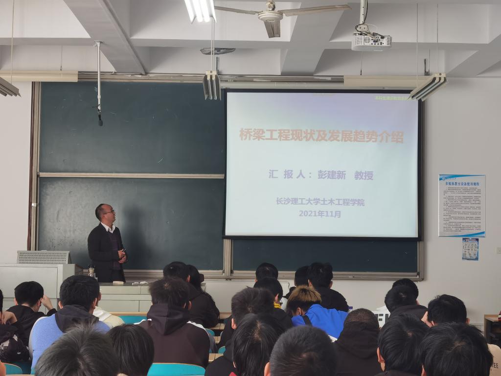 彭建新教授阐述了各个历史阶段桥梁建设所取得的主要成就及关键人物,以及对人类社会进步的巨大推动作用,特别是中华民族的贡献。讲座对现代桥梁的主要病害问题进行总结分析,介绍桥梁病害检测中的常用方法,并归纳桥梁发展趋势。他用生动形象的授课方式带领同学们体会了桥梁从古到今的奥妙,为同学们展示了一幅桥梁未来发展趋势的宏伟蓝图,给同学们留下了深刻的印象。