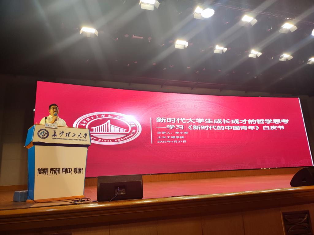 中国共青团成立100周年,为培养学生骨干力量,促进学生的成长成才,发挥青年先锋精神力量,4月27日晚,土木学院于五教大礼堂举办新时代大学生成长成才的哲学思考通识讲座。院团委书记董治佑和21级辅导员邓文杰担任主持人,学工办李小军应邀主讲。