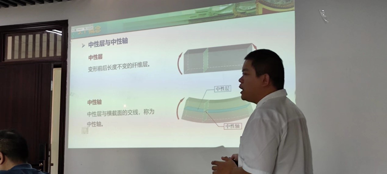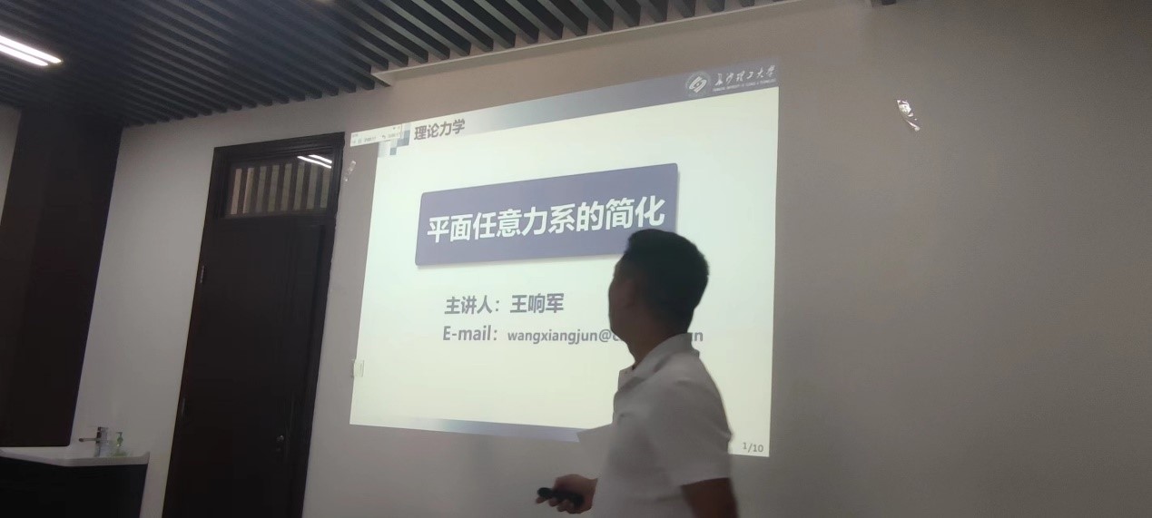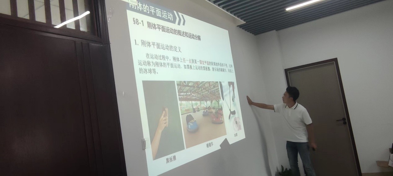 陶昶老师讲课的内容是材料力学课程的弯曲应力,陶老师从问题的引入、弯曲的概念、纯弯曲正应力的公式推导进行了讲解,讲课过程自然流畅、PPT精美、准备充分。王响军老师讲课的内容是理论力学课程的平面力系简化,王老师从力的平移定理、平面任意力系向平面内任意一点简化、平面任意力系简化结果、合力矩定理进行了讲解。赖安迪老师讲课的内容是理论力学课程的刚体平面运动,赖老师从刚体平面运动的概念、刚体平面运动的简化、平面运动的分解与合成进行了讲解,问题引入生动、时间把握精准、讲解流畅。