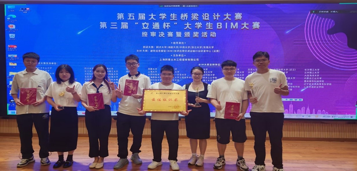 在学院裴必达老师的悉心指导下,决赛当天,我校学生与浙江大学、兰州交通大学、中国地质大学(武汉)等一流高校学生同台对决,经过项目汇报和专家组提问等一系列环节评审,最终我校的古筝行动组和我们都队分别在第五届大学生桥梁设计大赛中获得最佳结构设计奖B类一等奖和二等奖,并且两只支队伍在第三届交通杯大学生BIM大赛中也荣获了桥梁工程赛道二等奖和三等奖,同时我校被评得最佳组织奖。