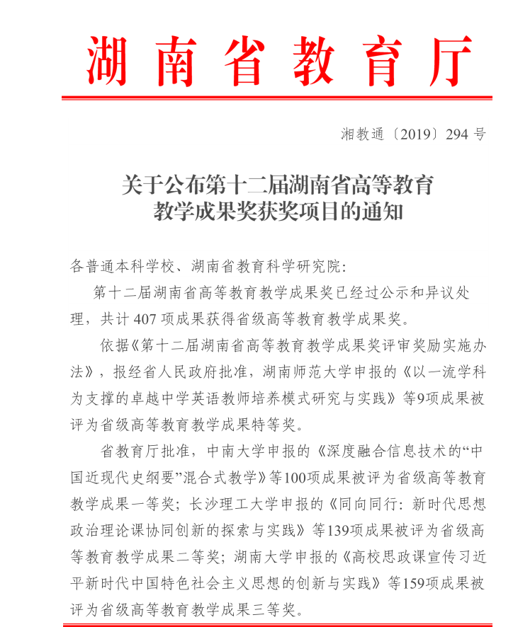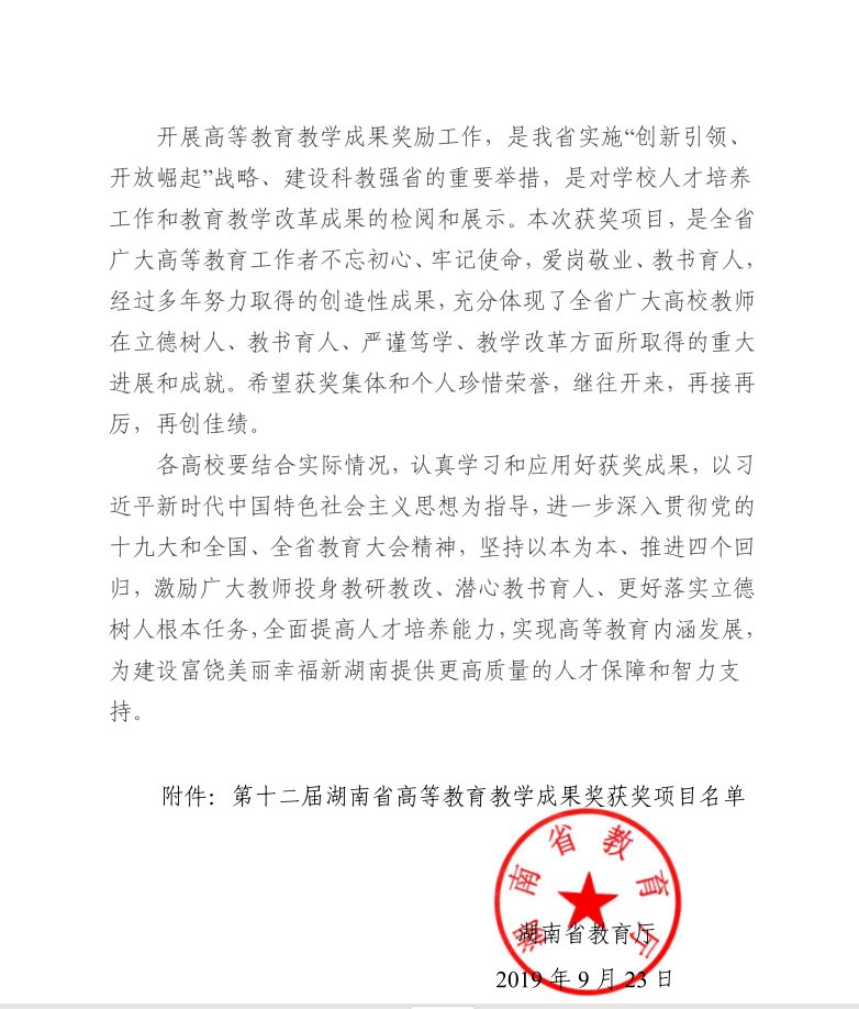 湘教通〔2019〕294号 关于公布第十二届湖南省高等教育教学成果奖获奖项目的通知(1).pdf