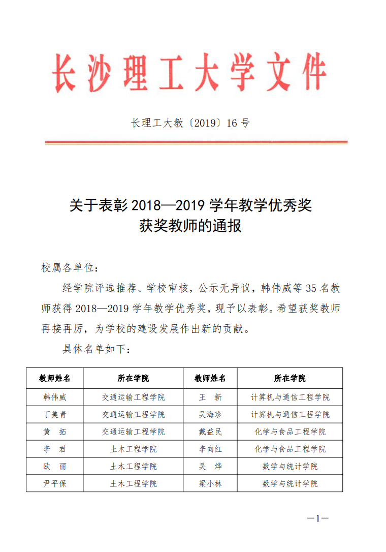 关于表彰2018-2019学年教学优秀奖获奖教师的通报