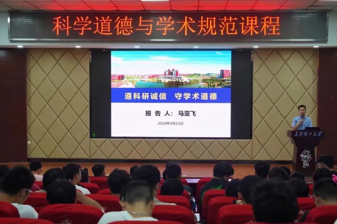 马亚飞以生动的案例开场,讲述了近年来发生的学术造假事件,并引导学生思考学术不端行为对个人、科研团队以及整个学术界的严重影响。他指出,科研诚信是科研工作者不可逾越的底线,任何篡改数据、抄袭、剽窃等行为都会对学术环境造成不可估量的破坏。讲座过程中,马教授还详细解读了国家关于科研诚信的政策要求,并结合学院的具体情况,强调了学院对学位论文的严格审查机制。
