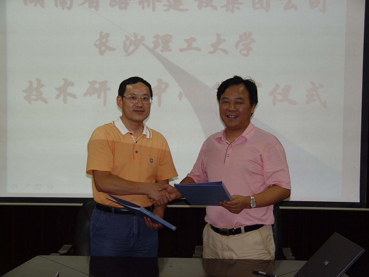 2008年7月7日下午,湖南路桥建设集团公司和土木与建筑学院技术研发合作协议签字仪式在16教205室隆重举行。湖南路桥建设集团公司董事长、总经理叶新平、副总经理梁振西等,土木与建筑学院院长颜东煌、院党总支书记陈若玲、副院长刘扬、桥梁与隧道工程学科教师代表出席签字仪式。