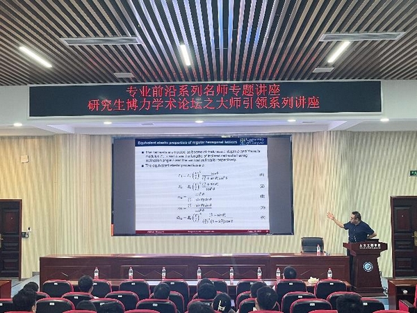 Adhikari教授首先介绍了超材料的研究历史、粘弹性分析公式及不规则晶格的等效弹性特性等,然后从不规则晶格的两种有效特性展开,并结合多孔超材料只有材料特性存在空间变化、多孔超材料内只存在几何不规则和多孔超材料的晶格均为正六边形晶格等特殊情况,对规则和不规则多孔超材料的动力学和等效弹性特性进行说明讲解。Adhikari教授还对老师和同学们提出的问题进行了解答。