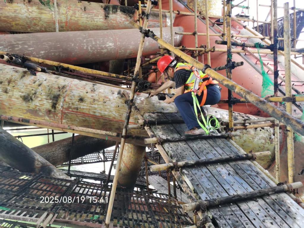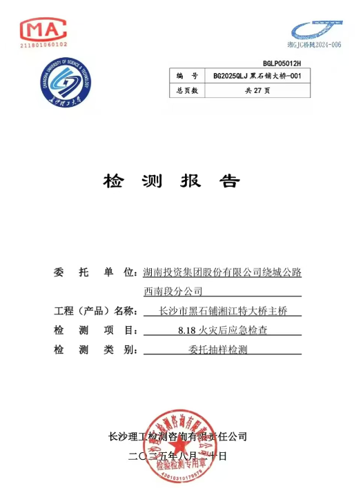 2025年8月18日18时43分,G0401长沙绕城高速西南段K51黑石铺湘江特大桥桥下施工区域,因防尘土工布燃烧引发火情。该桥2004年4月建成通车,至今已安全运营21年。火情发生后,桥梁安全成为公众关注的焦点,桥梁管理单位第一时间委托长沙理工检测咨询有限责任公司对桥梁进行安全检测。太阳成集团tyc122cc入口土木与环境工程学院建工系王中强老师主导完成了对黑石铺湘江特大桥主桥的火情现场调查、吊杆索力、拱肋变形及桥面线形测试,出具了《长沙市黑石铺湘江特大桥主桥8·18火灾后应急检查报告》。