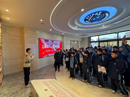 在“三全育人”教育基地,讲解员从“国之大者”“材之茂者”“师之贤者”“行之实者”四个部分向详细介绍了学校的发展历程、师资力量、办学成果、人才培养成效等情况,师生们通过一张张照片、一件件实物模型,切实感受到学校与时俱进的精神,以及所取得的丰硕办学成果。
