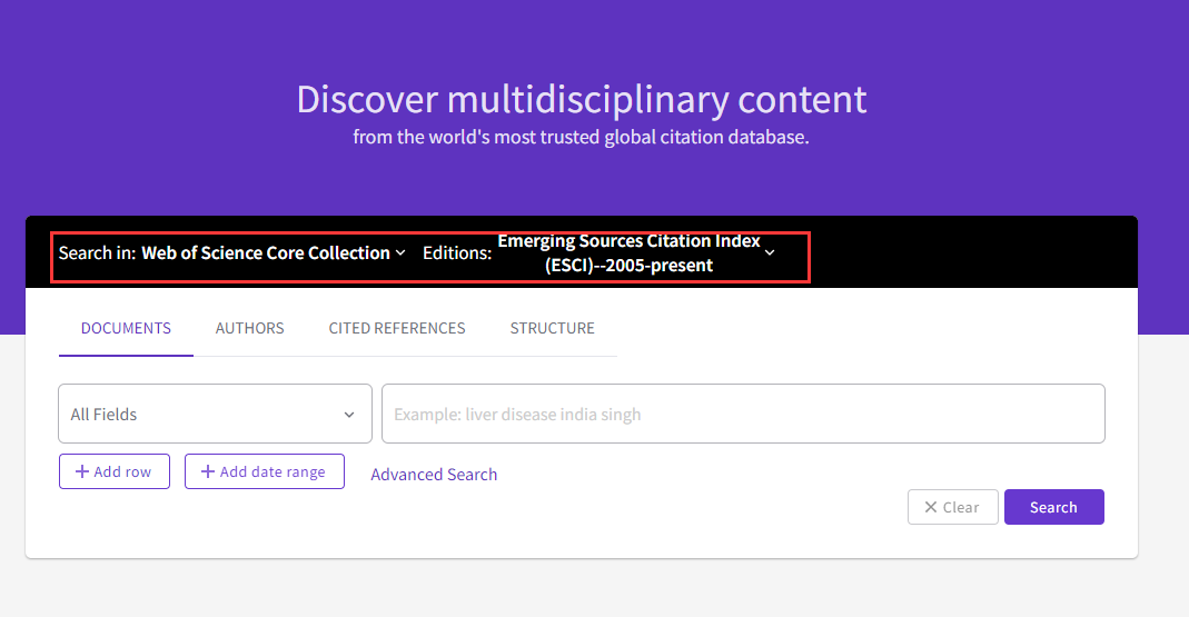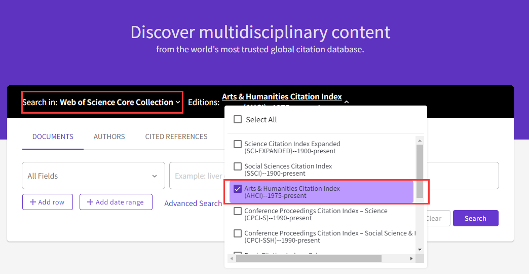 内容简介:Web of Science核心合集中的Arts & Humanities Citation Index(艺术与人文引文索引,简称A&HCI)收录了艺术与人文领域中最具权威和影响力的1800多种学术期刊,涉及了艺术与人文领域的28个学科,收录的内容最早可回溯至1975年,我校回溯至2021年。Web of Science核心合集中的Emerging Sources Citation Index(新兴领域引文索引,简称ESCI)包含自然科学、社会科学、人文与艺术三个领域的近8000种学术期刊,每周更新,最早回溯至2005年,我校回溯至2015年。A&HCI和ESCI收录了论文中所引用的参考文献,通过独特的引文索引,用户可以用一篇文章、一个专利号、一篇会议文献、一本期刊或者一本书作为检索词,检索它们的被引用情况,轻松回溯某一研究文献的起源与历史,或者追踪其最新进展。