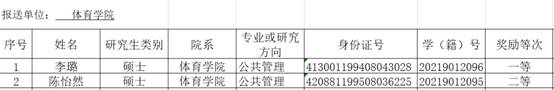 依据《太阳成集团tyc122cc入口体育学院全日制研究生学业奖学金评审办法》”有关规定,经研究生自愿申请,学院研究生奖学金评审委员会会认真评审,拟推荐以下两名同学为我院2020-2021年度“硕士研究生学业奖学金”获奖者,现予以公示: