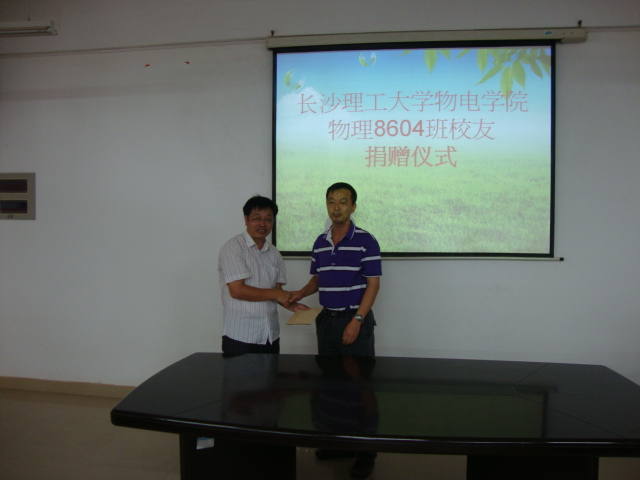物理8604班班长孙文举代表全班校友作了发言,倾吐岁月的变迁,感怀祖国的进步,感叹母校的变化,他诚挚表达了对恩师辛勤培育的感激之情。表达了将永远心系母校、感念师恩,在以后的日子会更加勤奋工作,以更加优异的业绩回报母校。同时,还代表全班同学向物电学院捐赠了电子显示屏,祝愿学院越办越好。接着,校友们乘车来到金盆岭校区参观了当年的图书馆,学生宿舍,体育场等曾给他们留下永恒记忆的场所,追忆当年自己的美好校园生活,在一办公楼前与校友办吴启茂副主任、院领导和前同行的07级的学弟学妹们一起合影留念。随后,校友们一一看望并宴请了当年的任课老师。历经20年的风雨,任沧桑变化,师生之情,同学之谊却在他们心中化作永恒。校友纷纷表示以这次聚会为契机,以后会与母校常保持联系,为学院、学校的发展贡献自己的力量。