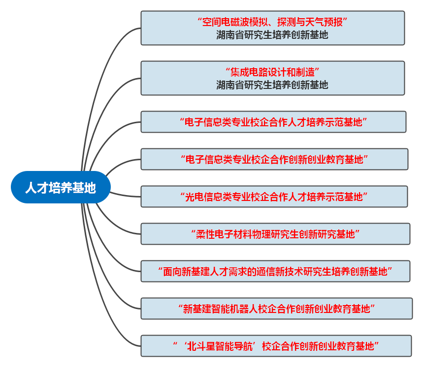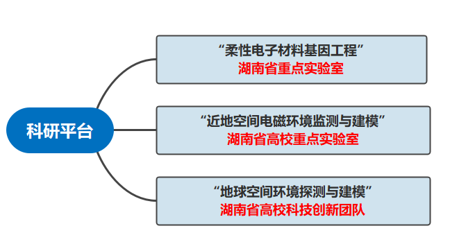学院拥有“电子科学与技术”湖南省“十二?五”重点学科、“柔性电子材料基因工程”湖南省重点实验室、“近地空间电磁环境监测与建模”湖南省高校重点实验室、“地球空间环境探测与建模”湖南省高校科技创新团队。同时拥有“空间电磁波模拟、探测与天气预报”湖南省研究生培养创新基地、“集成电路设计和制造”湖南省研究生培养创新基地、“电子信息类专业校企合作人才培养示范基地”、“电子信息类专业校企合作创新创业教育基地”、“光电信息类专业校企合作人才培养示范基地”、“柔性电子材料物理研究生创新研究基地”、“面向新基建人才需求的通信新技术研究生培养创新基地”、“新基建智能机器人校企合作创新创业教育基地”、等9个省级人才培养平台。