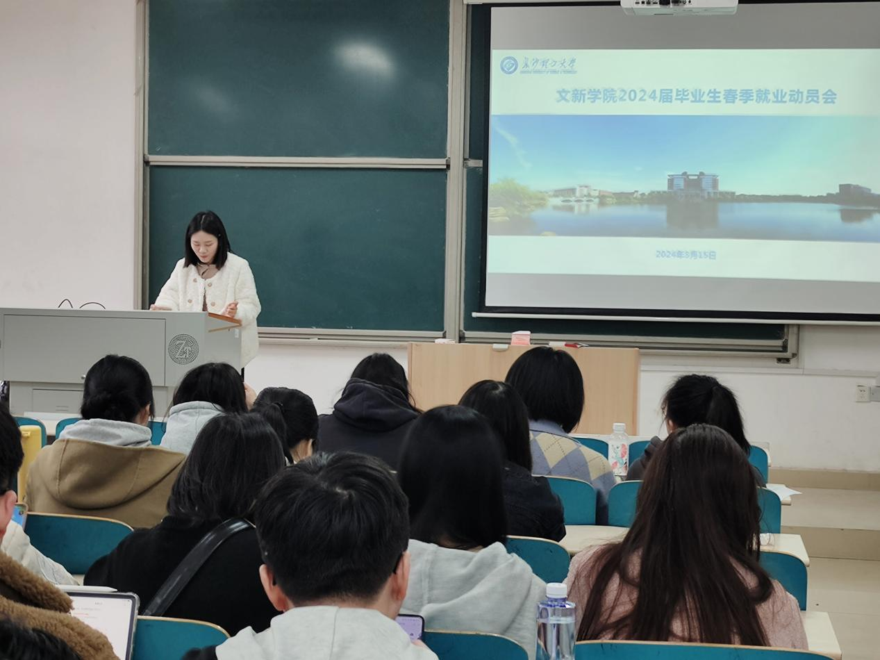 为推动2024届毕业生高质量就业,引导毕业生树立正确的就业观念,提高就业积极性和主动性,3月15日上午,文新学院于云塘校区文科楼召开2024届毕业生春季就业动员会,由毕业年级辅导员李敏主讲,2020级全体毕业生参与本次会议。