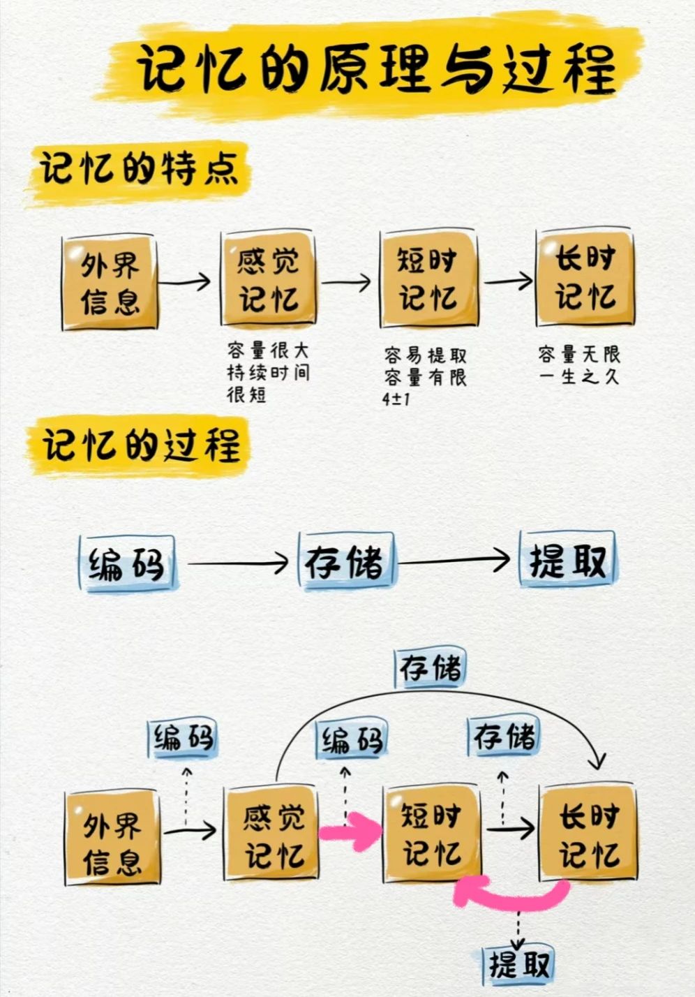 其实记忆可以分为四个过程,分别是识记、保持、再认和回忆。