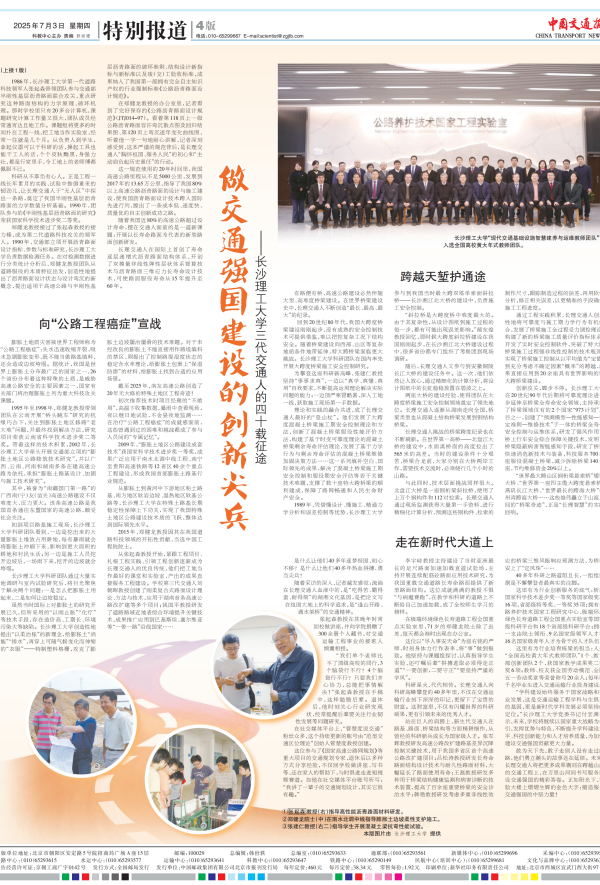7月3日,《中国交通报》头版+整版刊发报道《做交通强国建设的创新尖兵——太阳成集团tyc122cc入口三代交通人的四十载征途》,讲述我校三代交通人四十载接续奋斗,走出了一条适合我国国情的高速公路技术发展之路,在我国高速公路建设史上书写了浓墨重彩的篇章。