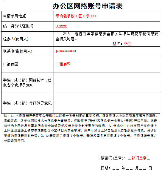 (1)本申请程序是落实公安部门上网安全责任制度的重要措施,请各申请人务必完整真实填写申请表、亲笔签名,各单位网络技术与信息安全管理员、行政领导(院长)和信息安全负责人(书记)严格审批。此表将作为上网者承担国家信息安全法规及学校信息安全制度责任的依据。