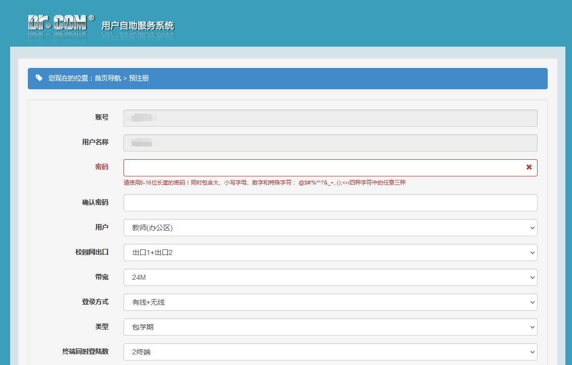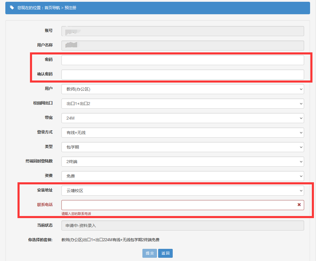 1.4 “预注册”页面中的“账号”、“用户名称”系统会自动填写,无需个人填写。个人需要用户类型选定为“教师(办公区)”并将“密码”、“校区+宿舍地址(即使用地址)”、“联系电话”补充完整即可。所有信息填写完毕、校核无误后,点击“提交”按钮,即可完成注册。如下图。